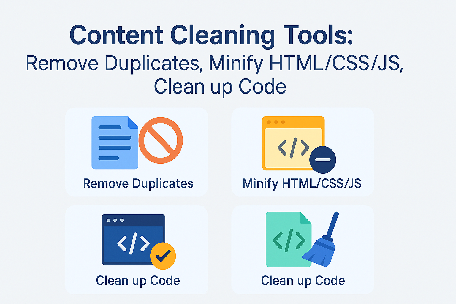 Discover the best content cleaning tools to remove duplicates, minify HTML/CSS/JS, and clean up messy code for faster websites.